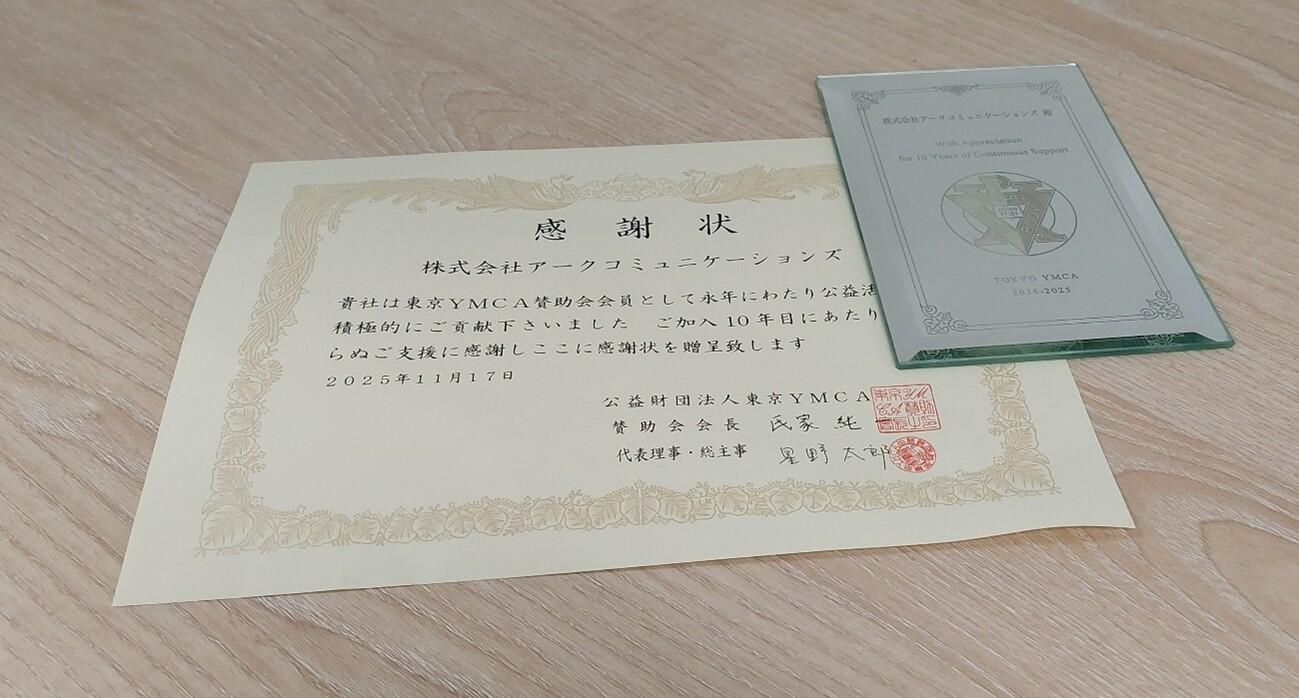 株式会社アークコミュニケーションズ(本社:東京都港区、代表取締役:大里真理子)は、東京YMCAの賛助会会員として10年間にわたり継続して支援を行ってきたことが評価され、このたび表彰を受けましたのでお知らせいたします。